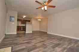 Open floor plan with spacious living room, separate dining space, and large kitchen with hardwood cabinetry, solid counters, and center island! Luxury vinyl plank flooring in main living space and bedroom! Inside utility with washer/dryer included! Plenty of storage with two coat closets in the living room and walk-in closet in the bedroom! Covered front patio with outdoor storage closet for your tools and toys!