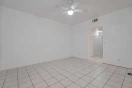 Charming 2-Bedroom First-Floor Condo with Covered Patio! This inviting condo features a spacious front living room with high ceilings throughout, creating an open and airy atmosphere. Enjoy a separate dining area equipped with a ceiling fan. With recently renovated bathrooms and a kitchen that includes a garden window, all-white appliances, quartz-countertops, and tile flooring. The large master bedroom offers patio access, a ceiling fan, and a walk-in closet, along with a private bath separate from the second bedroom. The unit also includes a washer and dryer for added convenience. Don’t miss out on this must-see gem—it won’t last long!