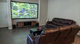 The common areas are furnished and include a 100" projector, weight lifting set, kitchen appliances, and dishware. We have a guest room where visitors can stay up to 3 nights.