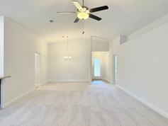 Inside, the stylish living room offers vaulted ceilings and an open, inviting atmosphere. Just off the living area, a generously-sized dining area is perfect for family gatherings or entertaining friends. The galley-style kitchen is a chef’s delight, featuring elegant cabinetry, granite countertops, luxury vinyl flooring, and a spacious eat-in area ideal for casual meals. Adjacent to the kitchen, the laundry room includes a full-size washer and dryer, plus an abundance of shelving for added storage.