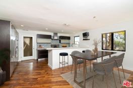 This sleek 3 bedroom + den/office contemporary home sits high above the street and affords city views from a very private setting. An open floor plan on the public level includes a large living room with fireplace and dark maple floors, an office/den, dining area, and very sleek, cooks kitchen featuring high end Thermador stainless-steel appliances, and caesarstone counters. The second floor bedroom level has expansive views to the west and opens to a large, sunny, landscaped terrace with spa. Master suite includes a glamorous bath, big, walk-in cedar lined closet, a fireplace, and views. Minutes to Lake Hollywood, the Hollywood Bowl, restaurants, shops, and the buzz of Hollywood. New carpet and paint.