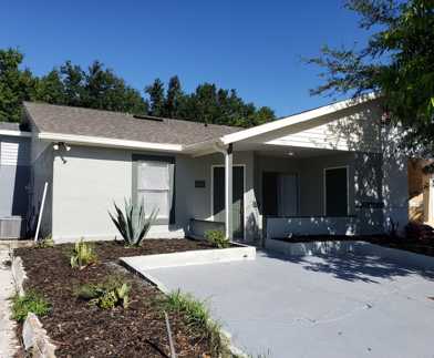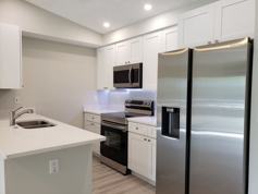 This amazing 2-bedroom / 1-bath condo was completely refurbished and remodeled 2 years ago with all new flooring, fresh paint (interior and exterior), counter tops, cabinets, lighting, fixtures, window blinds, plumbing and appliances! This corner end-unit with open front porch is located at the end of a quiet street with no passing traffic. The indoor layout features an open floor plan consisting of the living room and kitchen with upgraded stainless-steel appliances and under-counter accent lighting. Access the front porch from the sliding glass door in the living room. The master bedroom easily fits a queen-size bed, and the bathroom has been completely remodeled with all-new tub, toilet, sink, lighting, fixtures and vanity. There are ceiling fans in the living room and both bedrooms. Laundry connections are available for a stacked washer/dryer combo. The private driveway has room for 2 vehicles.