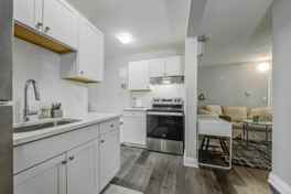 The unit located on the first floor and offers a bright and stylish kitchen features sleek white cabinetry, modern stainless steel appliances, and ample room for a kitchen table and chairs, making it perfect for casual dining.