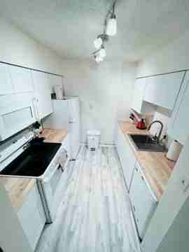 Freshly renovated 1-bedroom, 1-bath condo featuring newly installed wood flooring, updated kitchen appliances, and wooden countertops. The unit is pre-wired for high-speed internet (Xfinity).