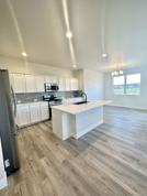 The large kitchen is perfect for cooking and entertaining, offering stainless steel appliances, a gas range, quartz countertops, a walk-in pantry, and a generous island for prep space or gatherings.