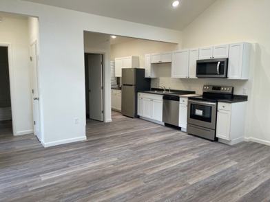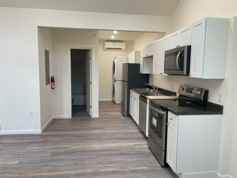 Fully remodeled; gray plank flooring, dark gray counter tops, new white cabinets, stainless steel appliances, electric fireplace, sliding glass doors; ceiling fans; fully remodeled bathroom; stackable W/D, Mini Split - Heating/Cooling.