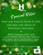 March Special!! Enjoy your choice of $100 Fee Rent off 1st Full Month or $100 Amazon Gift Card after move-in with Move-in by March 31, 2026!
