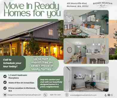 Nestled in a great South Richland neighborhood, Badger Mountain Ranch offers brand new one-, two- and three-bedroom apartments for rent. Enjoy an array of amenities including a theatre room, a shimmering pool and an invigorating spa where the serene setting, coupled with an awesome mountain view, will whisk you away. Part of the Richland School District, the community offers a prestigious Westcliffe address off of Keene Road in the Badger Mountain Village area. You will be proud to invite guests to your luxurious apartment home where style is at its finest.