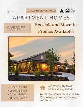 Nestled in a great South Richland neighborhood, Badger Mountain Ranch offers brand new one-, two- and three-bedroom apartments for rent. Enjoy an array of amenities including a theatre room, a shimmering pool and an invigorating spa where the serene setting, coupled with an awesome mountain view, will whisk you away. Part of the Richland School District, the community offers a prestigious Westcliffe address off of Keene Road in the Badger Mountain Village area. You will be proud to invite guests to your luxurious apartment home where style is at its finest.