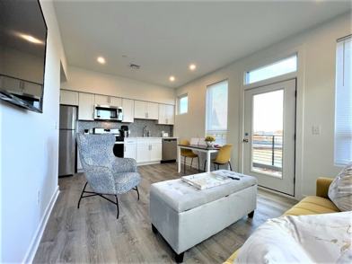 Open concept corner unit top floor,2 bedroom unit with white shaker cabinets, stainless steel appliances, stone quartz counter tops, tile bath with glass shower doors, in unit washer/dryer ,vinyl plank flooring, high ceilings, large windows with lots of natural sunlight,balcony with some views of Boston. Close distance to Wellington Station, Gateway center with restaurants, shopping, easy access to Encore Casino, Assembly Row and downtown Boston.