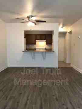 Large one-bedroom apartment newly remodeled with dining alcove off the living room, pass-through kitchen with dishwasher, living room has glass sliding doors to private patio. Central air conditioning, gas heat --gas is included in rent, tenants pay electric. Building has a laundry room with credit card operated machines.