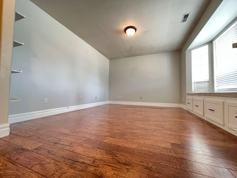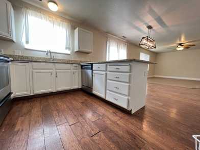 Welcome to this charming home boasting 4 spacious bedrooms and 2 full bathrooms. Upon entry, you're greeted by a generously sized office space adorned with built-in shelving and laminate hardwood floors that seamlessly extend into the kitchen and part of the living room, enhancing the bright, airy feel throughout. The kitchen showcases elegant white cabinets and modern stainless steel appliances, making meal preparation a joy.