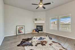 Welcome to this like-new home, built in 2022, and perfectly situated in a prime Yukon location with convenient access to NW Expressway and the Kilpatrick Turnpike. This well-maintained 3-bedroom, 2-bathroom residence offers modern living at its finest. The home features a two-car garage with an in-ground storm shelter for peace of mind. Inside, wood-look porcelain tile flooring creates a seamless and elegant feel throughout the main living areas. The open-concept layout is centered around a cozy corner gas fireplace and a stunning kitchen, which boasts quartz countertops, a large island with bar seating, and plenty of natural light from large windows. The spacious primary bedroom is a true retreat, with an en-suite bath featuring double vanities, a luxurious jetted tub, a walk-in shower, and a large closet. Outside, a covered patio with an additional gas fireplace provides the perfect space for year-round outdoor entertaining.