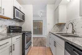 The remodeled kitchen boasts stainless steel appliances and modern finishes, providing the perfect space for meal prep and entertaining guests.