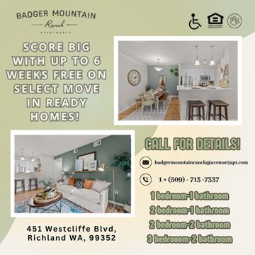 Nestled in a great South Richland neighborhood, Badger Mountain Ranch offers brand new one-, two- and three-bedroom apartments for rent. Enjoy an array of amenities including a theatre room, a shimmering pool and an invigorating spa where the serene setting, coupled with an awesome mountain view, will whisk you away. Part of the Richland School District, the community offers a prestigious Westcliffe address off of Keene Road in the Badger Mountain Village area. You will be proud to invite guests to your luxurious apartment home where style is at its finest.