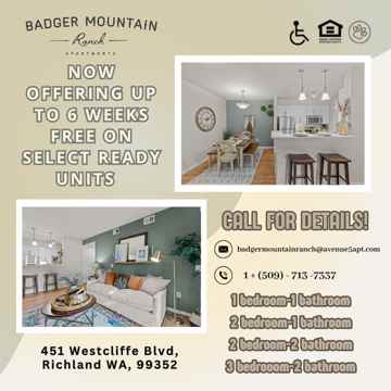 Nestled in a great South Richland neighborhood, Badger Mountain Ranch offers brand new one-, two- and three-bedroom apartments for rent. Enjoy an array of amenities including a theatre room, a shimmering pool and an invigorating spa where the serene setting, coupled with an awesome mountain view, will whisk you away. Part of the Richland School District, the community offers a prestigious Westcliffe address off of Keene Road in the Badger Mountain Village area. You will be proud to invite guests to your luxurious apartment home where style is at its finest.