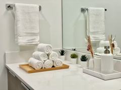 Our living room is by far the area we get the most praise on. This cozy yet elegant living room features a high-end sofa, tempered glass coffee table, a 65" LG smart TV and floor-to-ceiling windows which capture the breathtaking essence of the panoramic views of Lower Mainland and the North Shore mountains. It also has access to the huge patio aforementioned, offering an outdoor-indoor living experience. The sofa is also large enough to sleep one or two people. Extra pillows and blankets are stored in the closets if required. Step-by-step instructions are provided in the Guest Manual to access Wifi, Netflix, Youtube, PrimeVideo, DisneyPlus, Tubi, Telus Cable TV, etc.