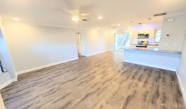 First class renovation done on this open planned, light, bright and cheery home, in Sarasota Springs. This open floor plan is flooded with natural light from abundant and large windows. The kitchen has solid wooden cabinetry, topped with slab granite counters with breakfast bar and pendant lights, custom backsplash, pantry, pass thru window to lanai, wine frig, all complemented with stainless steel appliances and under cabinet lighting. The kitchen is open to dining area and living room for easy family time and entertaining. The master bedroom is on the other side of the home from remaining two bedrooms and is spacious with door to lanai and wall of closets. The en-suite bathroom has dual sinks and walk in shower. NO CARPETING-all water proof vinyl flooring and tile. The lanai is covered and screened with a tranquil view of your fully fenced back yard. There is a two car garage and that is where the full size laundry is. This home is well located, convenient to shopping, dining, good schools, not far from downtown Sarasota and the beach. Call NOW for your next home!