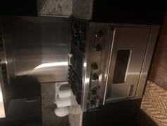 The **chef’s kitchen** includes granite countertops, marble backsplash, stainless steel appliances, and a **Viking stove with hood**, plus refrigerator. Two remodeled bathrooms with travertine tile and modern finishes. **Washer & dryer included**.