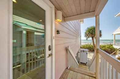 A private balcony and patio invite alfresco dining, morning coffee with the sound of the surf, or evening cocktails as the sky glows over the water. The fully equipped kitchen features updated appliances, ample cabinetry, and a coastal-inspired design that makes entertaining effortless.