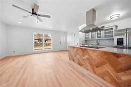 Step into an inviting open living area ideal for relaxation and gatherings. Highlights include a striking non-burning brick fireplace with oversized hearth and painted mantel, wide neutral plank floors, subtle crows feet texture walls in designer light neutrals, 2-inch crown moulding, dimmable recessed lighting, and a stylish ceiling fan.