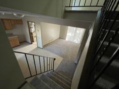 Split level side by side unit with huge kitchen area and tons of cabinets! New carpet and paint throughout. Two bedrooms and bath on upper level, along with kitchen/living room area and laundry on lower level. Two car detached garage.