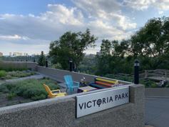 In the heart of Oliver, this large 1140 sq. foot, 2-bedroom, 2-bathroom, 2-balcony updated apartment offers exceptional value, with easy access to downtown, entertainment district, shopping, amenities, universities, and transit (2 blocks from Grandin LRT Station). Enjoy beautiful walking trails and a green belt as your backyard and unobstructed view from the 9th floor. Morning sunlight streams into the wall of living room windows and reflective light on the city at sunset is a spectacular way to end your day! The apartment has been freshly painted throughout in warm vintage tones, has new Alaskan Oak plank flooring, a renovated bathroom with soaker-tub plus shower surround, new windows, and balconies that have been refurbished this summer. The galley kitchen (white cabinetry and cyber-grey countertop) is brightly lit with new track lighting, and you will enjoy setting the mood with dimmer switches in the kitchen, dining, and main bathroom. This apartment provides loads of storage space – in the large entrance and linen closets, separate storage room, plus closet organizers in the bedroom and kitchen cupboards. The laundry room is conveniently located beside the 906 entrance door. VICTORIA PARK provides a garden courtyard for relaxing outside, a fitness room, a rooftop lounge, a heated underground parkade, plus Grandma's Pizza on the ground level. It's a great neighborhood to call home!