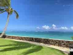 From the oceanfront room, the sliding glass doors lead you to a sizable lanai where you’ll find a picnic table, perfect for outdoor dining, as well as a private hot tub. A beautifully maintained lawn and tall palm trees frame the oceanfront, which lays just beyond the property’s rock wall.