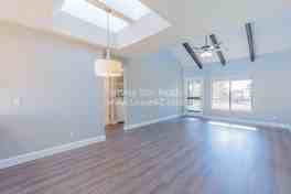 The adjacent dining space has a lovely SKYLIGHT, while the living room boasts TALL vaulted ceilings with beams! The living room also overlooks the private rear balcony/patio with stunning lake views!