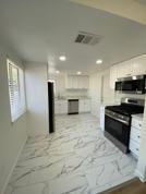 Brand new kitchen cabinets and appliances including microwave and refrigerator.