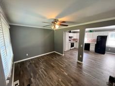 Entering the home from your private front patio, you walk into an open-concept living room beaming with natural light from all directions. The living room opens to your spacious kitchen and dining area. Beautifully updated, your kitchen has all of the cabinet space you need, including a standing pantry, and kitchen sink overlooking the enormous backyard.