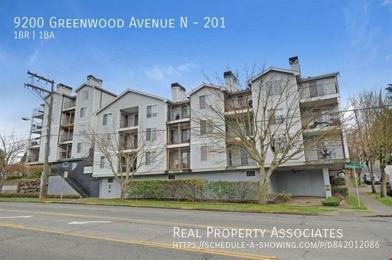 Spacious layout with open living room and dining room design. Awesome view of the snow-capped Olympic mountains from the living room, balcony & bedroom. In-unit washer and dryer! Enjoy a beverage on the private patio or cozy up next to the wood-burning fireplace during the cooler seasons. This is simply the best location with quick access to Highway 99, I-5, Green Lake Park, and direct bus access to Seattle and UW. Close to shops, boutiques, restaurants, and more!