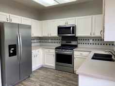 * Stunning eat-in kitchen boasting whirlpool stainless steel appliances, gas range, white cabinetry (ample cabinet space!),porcelain ceramic tile backsplash and double sink!