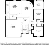 The floor plan positions the main bedroom on one side of the home for added privacy. This room features generous dimensions, a walk-in closet, and direct access to an en-suite bath complete with an oversized vanity and step-in shower. Two additional bedrooms and a second full bath are thoughtfully arranged off the main hall, providing versatility for hosting, hobbies, or daily routines. A dedicated laundry room and two-car garage add practical touches to the home’s overall functionality.