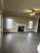 The home features durable and stylish luxury vinyl plank flooring throughout, complemented by a tiled kitchen designed for both everyday living and entertaining. Stainless steel appliances, ample cabinetry, and an open, inviting layout create a kitchen that is as practical as it is visually appealing. A cozy fireplace anchors the living space, adding warmth and character to the home.