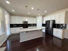 Inside, the home features a striking island kitchen with granite slab countertops, stainless steel appliances (including a French‑door fridge), a stainless steel sink, glass subway tile backsplash, and a walk‑in pantry—perfect for everyday cooking or hosting.