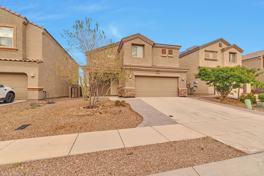 This 4-bedroom, 2.5 bath home is located in the award-winning Vail School District. This spacious home is a must see with solar paneling to save money on electricity. The main living area is open and bright with ceramic tile flooring. There is a 1/2 bath conveniently located downstairs, while the bedrooms, laundry room and other bathrooms are located upstairs. Downstairs you will also find a large office space with built-in desk and drawers. The kitchen features a large island and stainless-steel appliances, new cabinets and marble countertops. The upstairs has a large loft perfect for a game room or play area. The backyard is low maintenance with rock, artificial grass, and a large shed. There are no neighbors directly behind you and amazing mountain views. Washer/Dryer are included.