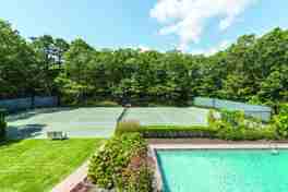 Located on a private 1.2+/- acre in Quogue Village, this 4662 sq. ft. Post Modern home greets you with a grand 2-story entryway that leads to a great room with a vaulted ceiling, wood-burning fireplace and built-in bookshelves and cabinetry. A wall of sliders brings in lots of light and opens to the expansive mahogany deck, heated gunite pool and Har-tru tennis court. The open floor plan includes a formal dining room, and a chef's kitchen with top of the line appliances, Caesarstone countertops, wine refrigerator, and an oversized center island. The breakfast area opens to the screened porch that overlooks onto the backyard. The first floor primary suite includes a gas fireplace, two walk-in closets and a newly renovated spa bath with separate shower and a soaking tub. Upstairs there are three additional en suite guest bedrooms and a junior primary suite with its own private deck. In addition, there is a gym with a Peloton bike, elliptical machine and free weights. The newly finished basement includes a full bath and a game room with a ping pong table, shuffleboard table, and a wet bar. Access to the Quogue Village Beach completes the perfect summer vacation home. Listing ID #738013