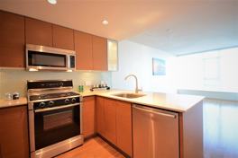 LOCATION! LOCATION! LOCATION! Lotus built by famous high end developer CRESSEY. Spacious and functional 1 bedroom 1 bath unit in the heart of RICHMOND. This unit featuring quartz counter top & high end BOSCH stainless steel appliances including fridge,microwave oven and gas stove/oven. This building was one of the first building in Richmond that features Geothermal Heat Pump that COOLS your unit during the HOT summer days with LOW energy bill. Featuring indoor swimming pool, sauna, hot-tub and gym at your convenience. Richmond Oval, banks, grocery shopping, restaurants, public transit including sky-train & much more are just steps near.