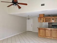 Beautiful interior design, high ceiling in living room, tile floors throughout, tile kitchen. Kitchen, dining and living room is open concept. Private fence in concrete patio. Two parking spaces in the back.