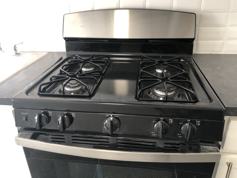 Refrigerator, gas stove, microwave oven.