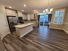 Gourmet Kitchen: Upgraded cabinets, Quartz countertops, stylish backsplash tile, stainless steel appliances, and a large center island overlooking the living and dining area. Includes a spacious walk-in pantry.
