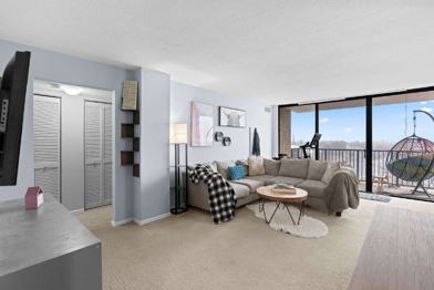 This fully refreshed 1-bedroom condo features **brand new flooring, fresh paint, and a bright, open layout** filled with natural light. The expansive living area is anchored by a **sleek, modern fireplace**, creating a warm, upscale focal point, while large sliding doors lead to your **private balcony with gorgeous elevated views**—perfect for relaxing or entertaining.