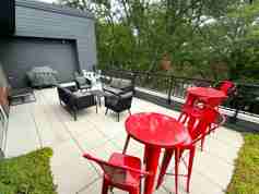 Building amenities include a community room with fireplace, kitchen, and flat-screen TV; a rooftop terrace with grill; a fitness center; a business center with Wi-Fi; and a large back courtyard patio.