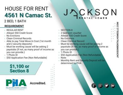 Monthly Rent and Security Deposit will be determined by PHA