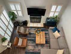 Bright and open layout with vaulted ceilings and a cozy fireplace.