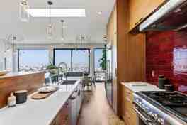 The main floor (top floor) features an open floor plan built for entertaining with soaring ceilings, skylights, floor to ceiling windows, walk-out deck, fabulous chef’s kitchen with a generous size center island, spacious living room and dining room as well as large bedroom with fireplace. Custom made walnut cabinetry, soapstone and white Eurostone countertops, Thermador Professional 48” 6-burner range with griddle and dual oven, Miele oven, Porcelanosa fixtures and tiles.