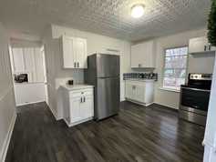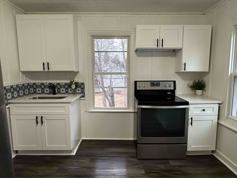 The stylish new kitchen boasts stainless steel appliances, brand new sleek countertops, and a warm inviting atmosphere.