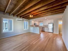 The kitchen is outfitted with an electric range, built-in microwave, dishwasher, refrigerator, stainless-steel sink, and plenty of cabinet and counter space. The exposed rafters and Edison bulbs add warmth to the living room. The bedrooms have large closets and extra storage nooks.