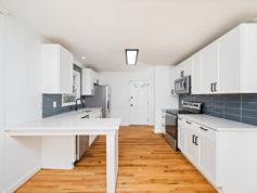 The kitchen host brand-new stainless-steel appliances, Level 4 quarts sitting on new cabinets, disposal and a seated bar.